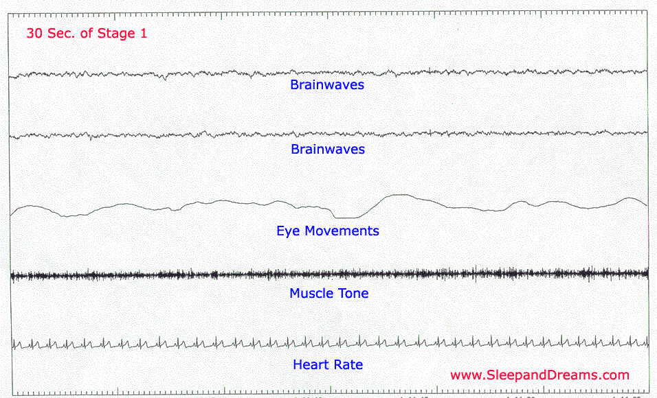 All of the stages of sleep have different patterns of brainwaves, eye movements and muscle tone. Each 30 seconds of recording is called an epoch and great examples of actual recordings are shown below.