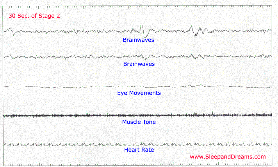Notice how the brainwave activity shows little spikes. These are called K-complexes and they are usually followed by spindle-like activity known as sleep spindles. Eye movement stops during stage two. You spend most of the night in this stage of sleep. Stages one and two are known as desynchronized sleep.