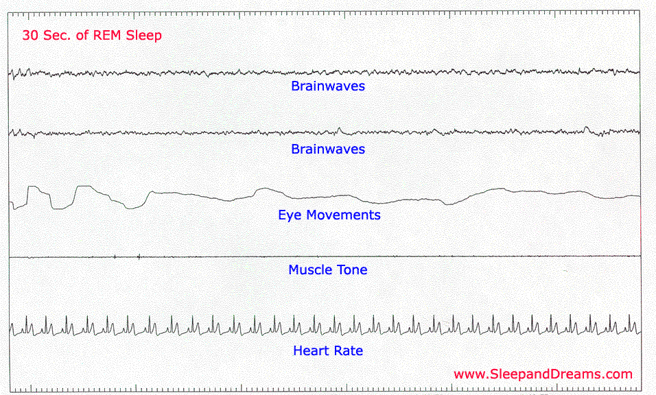 Brainwave activity looks like it does when awake, it’s very active. Ah ha! We must be dreaming. Dreams are most vivid during REM sleep, although we do dream in the other stages of sleep. Notice the active Rapid Eye Movements (REM). Some theorists feel we may be watching what is going on in our dreams.
